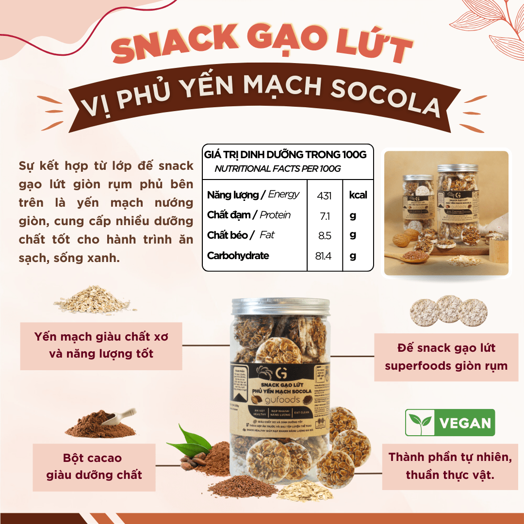 Snack gạo lứt phủ yến mạch socola GUfoods - Nạp nhanh năng lượng, Ăn vặt healthy, Thuần chay, Eat clean