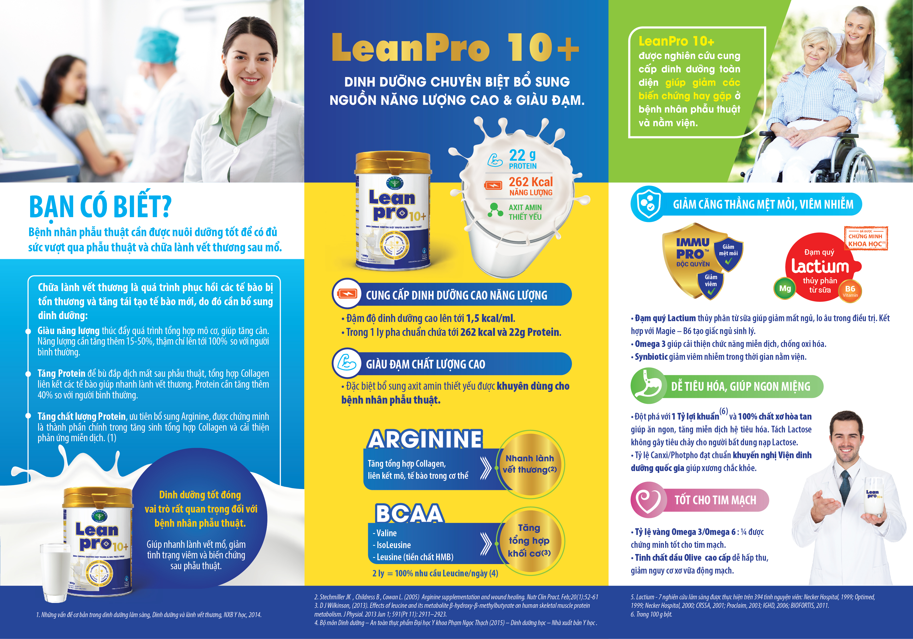 - Sữa Lean Pro 10+ Nutricare Dành Cho Bệnh Nhân Trước, Trong Và Sau Quá Trình Phẫu Thuật là dinh dưỡng chuyên biệt cho người phẫu thuật, cung cấp năng lượng và Protein cao vựợt trội, duy nhất với công thức độc quyền IMMU PRO giúp phục hồi dinh dưỡng, nâng cao sức đề kháng, nhanh lành vết thương và giảm căng thẳng mệt mỏi.