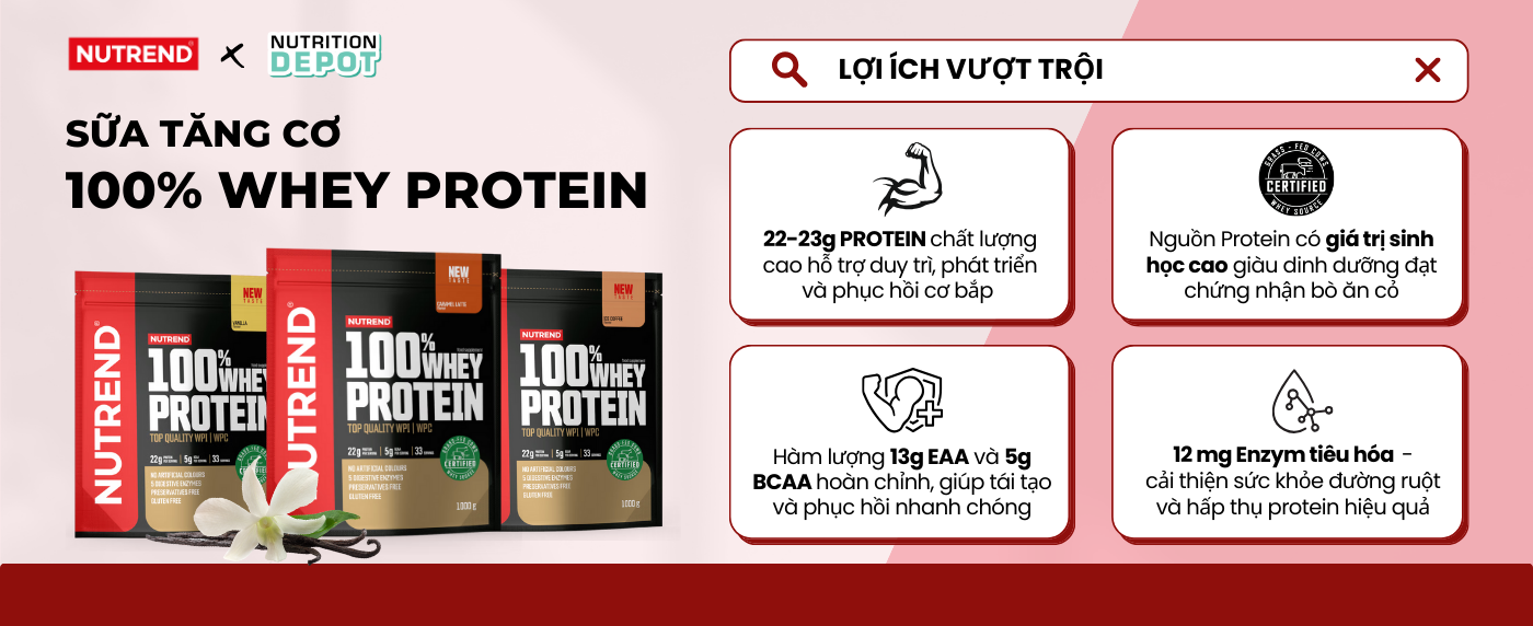100% Whey Protein là loại bột Protein chất lượng cao đến từ nhà sản xuất Nutrend, với công nghệ CFM giúp đạm giữ nguyên các hoạt chất sinh học, kết hợp hoàn hảo giữa chất đạm, EAA và BCAA, không chỉ giúp bạn tăng sức mạnh và sự phát triển của cơ bắp, mà còn hỗ trợ quá trình phục hồi sau khi luyện tập. Sản phẩm này được tạo thành từ Whey Protein cô đặc tiêu chuẩn cao cấp đã quan lọc siêu vi (WPC) kết hợp với dạng tinh khiết nhất của Whey Protein Cô lập ( WPI)