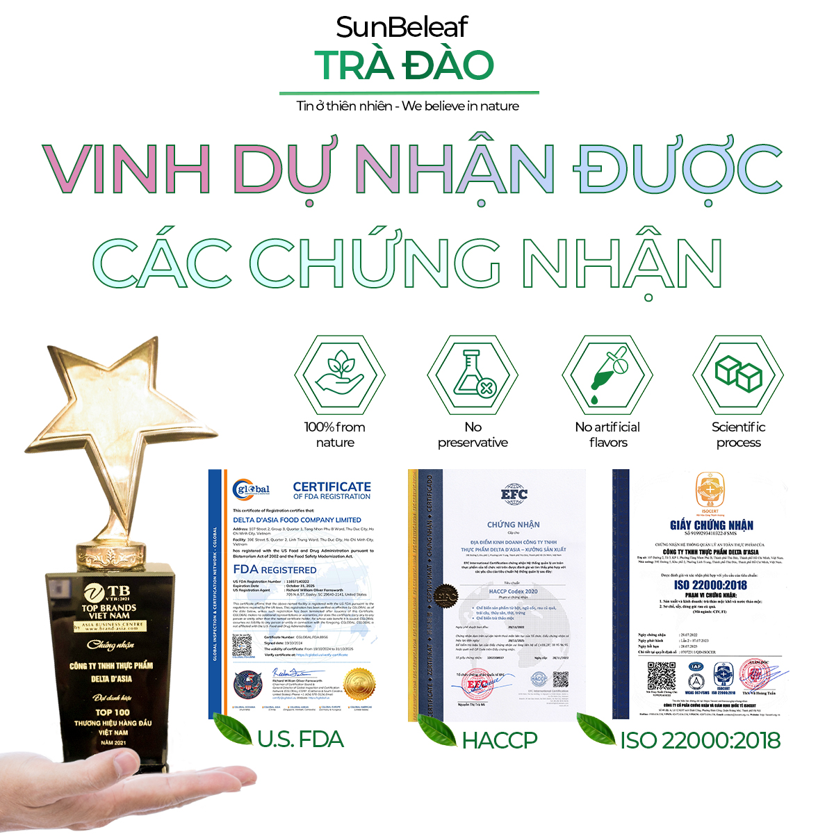 SunBeleaf tự hào đồng hành cùng Quý Khách trên hành trình chăm sóc sức khỏe và tận hưởng những giá trị tuyệt vời từ thiên nhiên. Với cam kết không ngừng nâng cao chất lượng sản phẩm, chúng tôi ứng dụng dây chuyền sản xuất hiện đại đạt chuẩn quốc tế như FDA Hoa Kỳ, HACCP, và ISO 22.000:2018. Sunbeleaf là lựa chọn hoàn hảo để tận hưởng hương vị tự nhiên, giúp giải khát, thư giãn, bổ sung năng lượng, hỗ trợ tiêu hóa và mang đến cảm giác sảng khoái mỗi ngày.