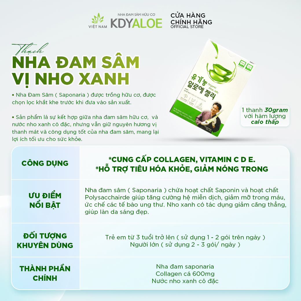 Thạch nha đam sâm vị nho xanh của KDY ALOE được chiết xuất từ nha đam Saponaria của Hàn Quốc kết hợp với nước nho xanh cô đặc, tạo nên một sản phẩm THẠCH NHA ĐAM SÂM VỊ NHO XANH không chỉ ngon mà còn có nhiều lợi ích cho sức khỏe