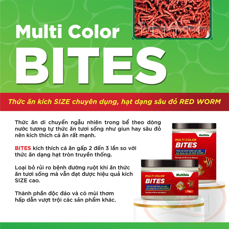 Thức ăn cá Multi Color Bites chuyên dụng tăng màu cho các dòng cá kích thước trung bình như cá dĩa, thần tiên, cầu vồng, thạch mỹ nhâ Thức ăn dạng thanh sâu đỏ tái hiện di chuyển ngẫu nhiên trong bể kích thích cá bắt mồi mạnh.