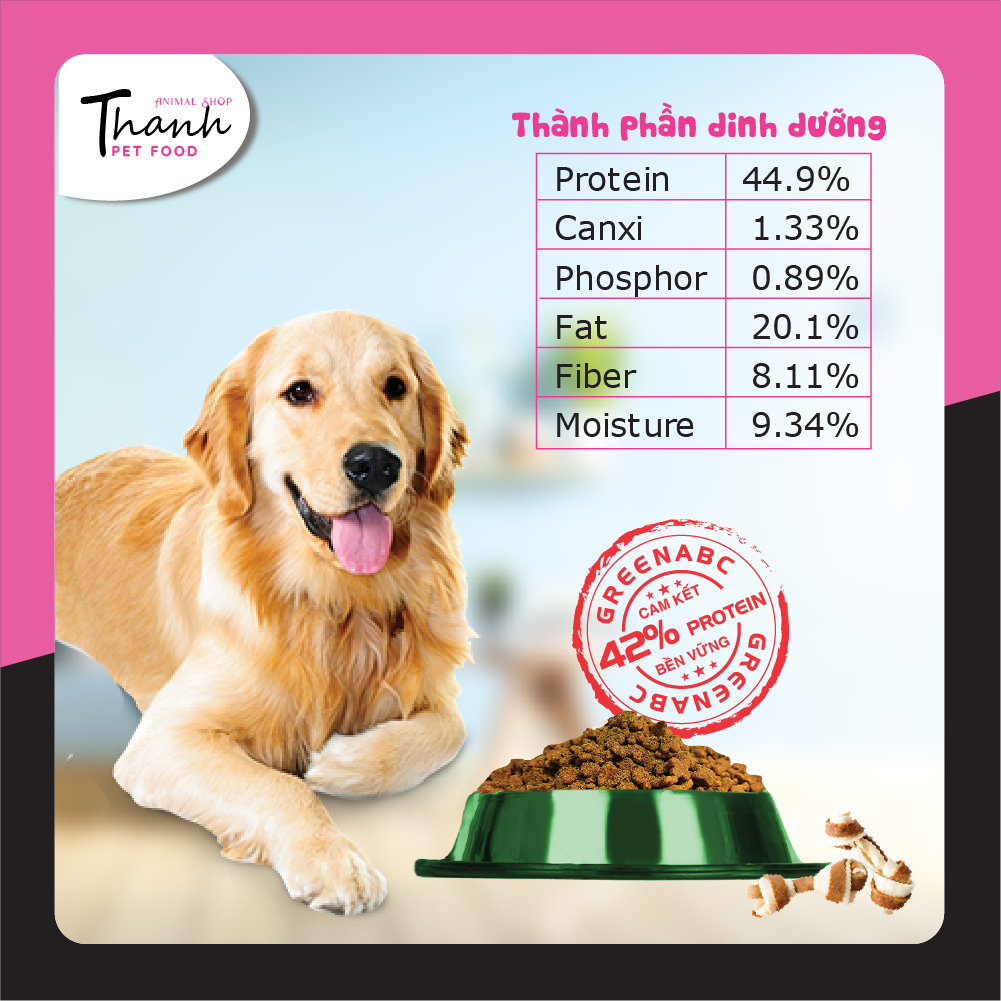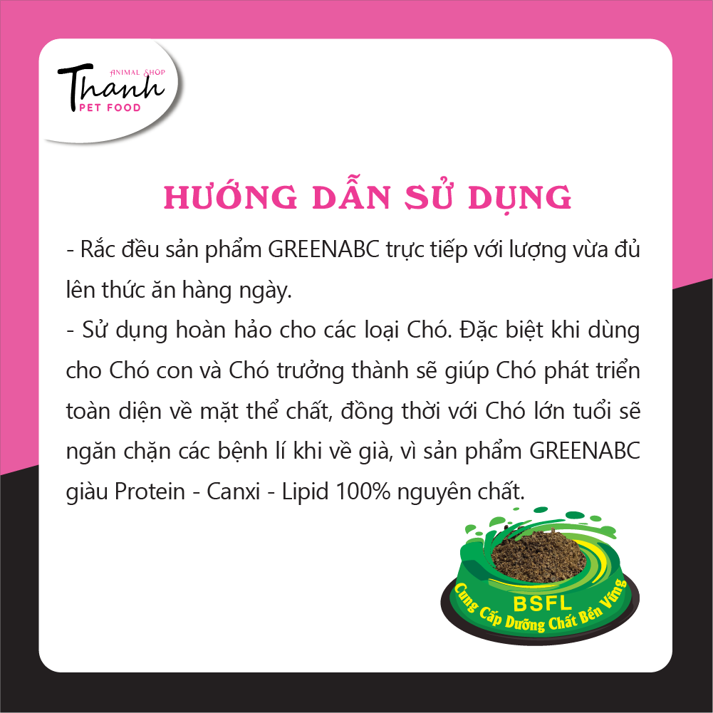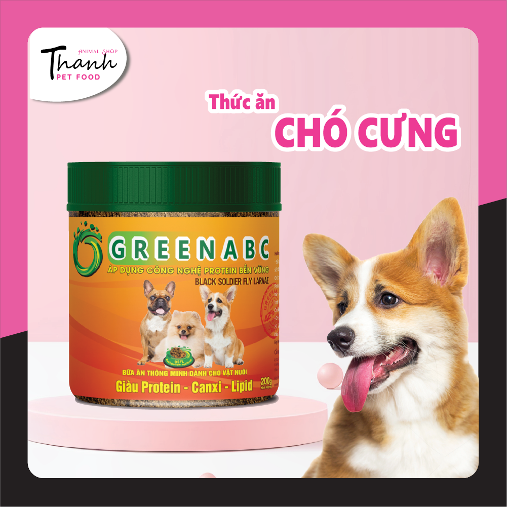 GREENABC là thức ăn cao cấp dành cho các loại chó. Đặc biệt sản phẩm GREENABC được sản xuất theo phương pháp Áp dụng công nghệ PROTEIN BỀN VỮNG từ bột đạm G.Meal rất giàu PROTEIN–CANXI–LIPID có trong BSFL*, đã được Mỹ (AAFCO) và EU chấp nhận đưa vào công thức cho ngành sản xuất thức ăn dành cho thú cưng.