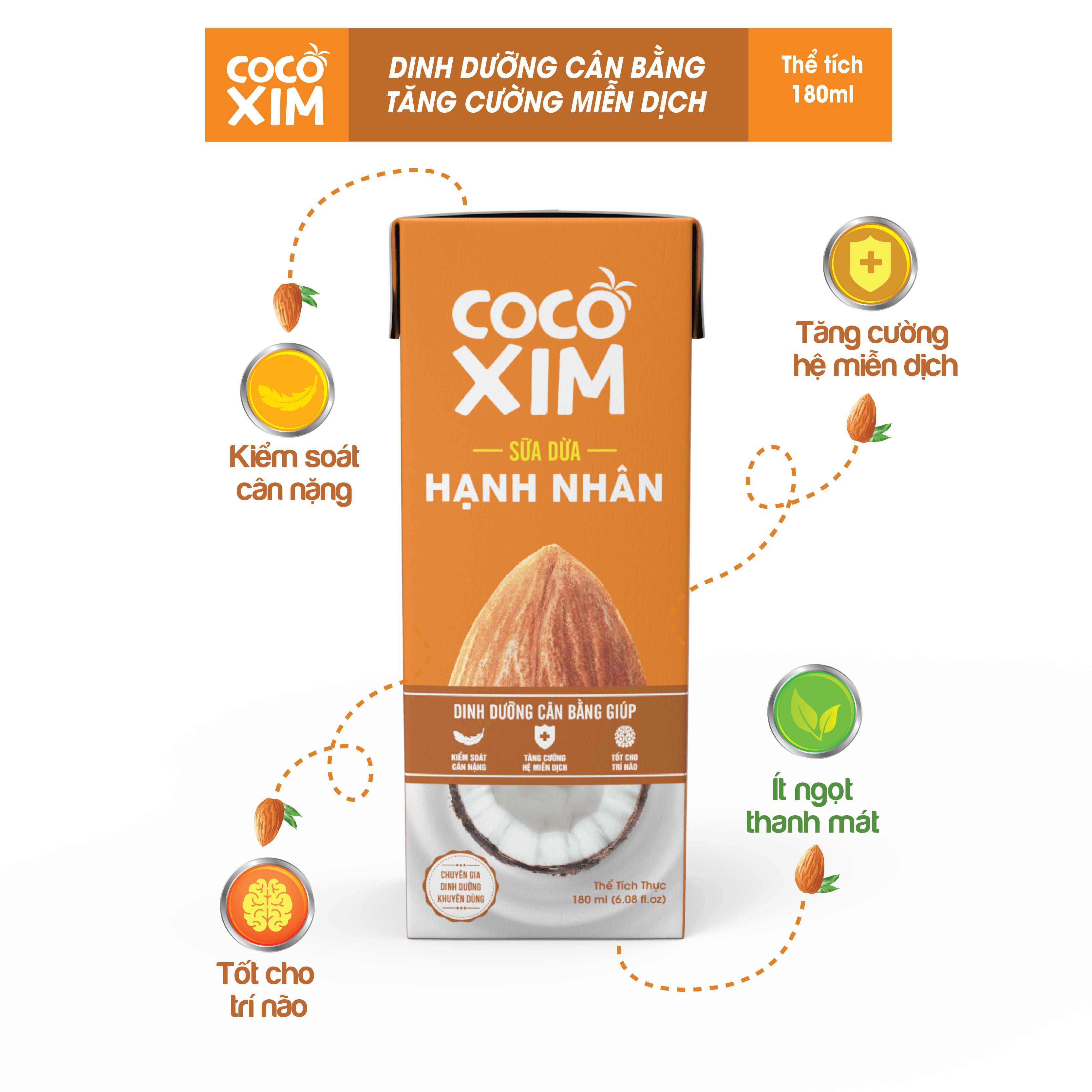 Nước trái cây dinh dưỡng cân bằng cho sức khỏe Sữa Dừa Hạnh Nhân - Thương hiệu COCOXIM 180ml.
