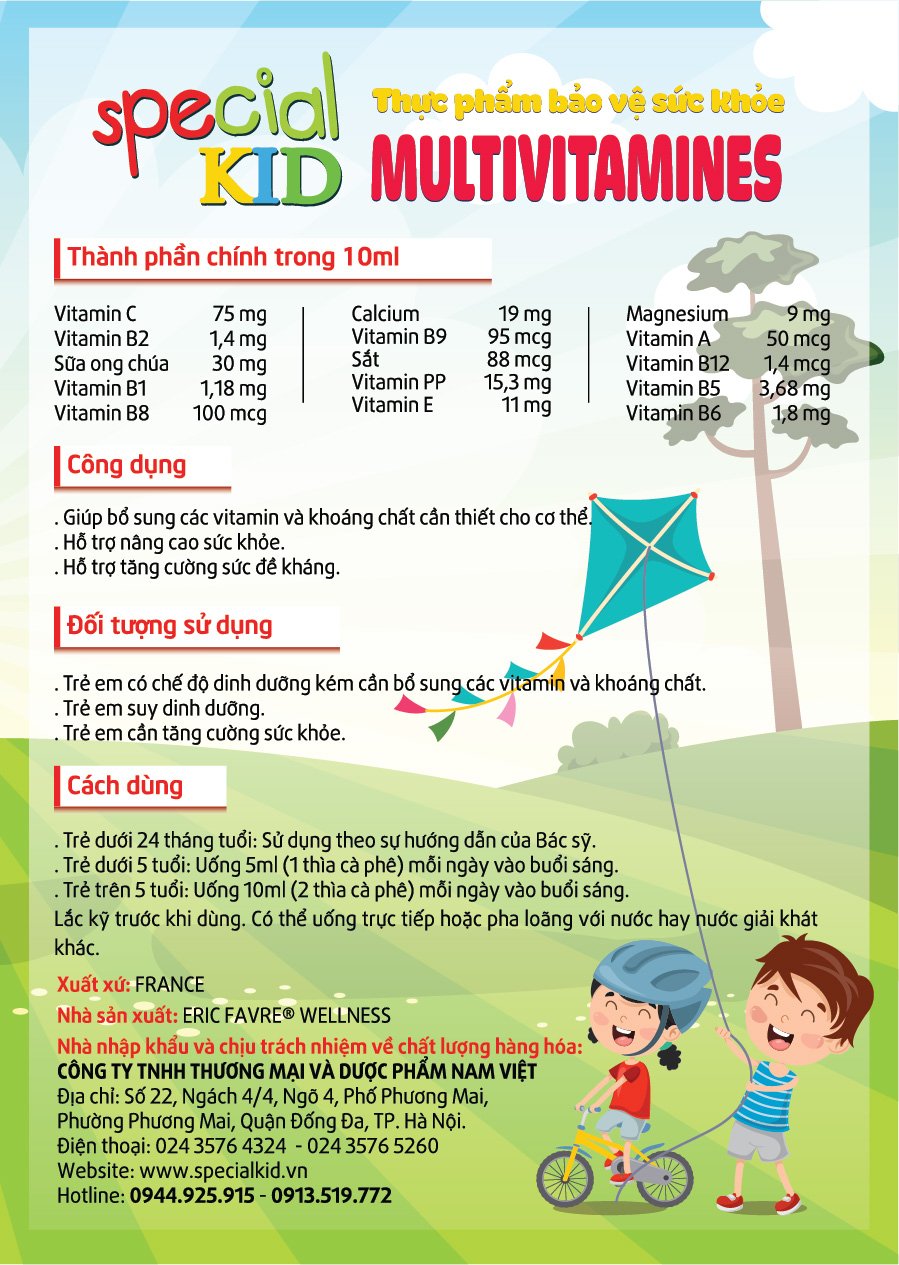 Special Kid là thương hiệu nhập khẩu nguyên hộp từ Pháp, đáp ứng hầu hết nhu cầu phòng và hỗ trợ điều trị các bệnh thường gặp của trẻ trong những năm tháng đầu đời. Special Kid Multivitamines được bào chế chuyên biệt dành cho trẻ em, mùi vị dễ chịu, chỉ cần sử dụng 1 lần/ngày. Tiết kiệm. Dễ nhớ
