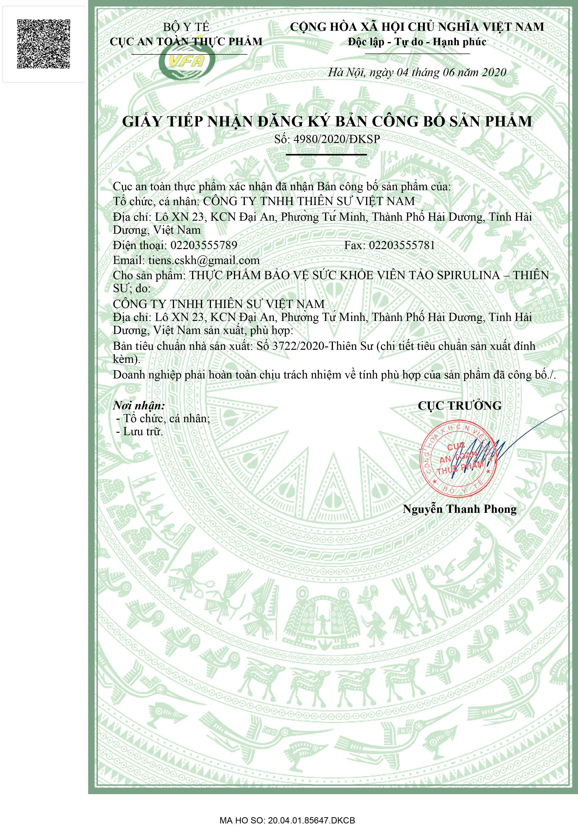 Sản phẩm của Tiens nhận được rất nhiều chứng nhận của Việt Nam và Quốc tế về chất lượng sản phẩm như : Hala , FDA của Hoa Kỳ, Chứng nhận doanh nghiệp công nghệ cao, chứng nhận hệ thống quản lý an toàn thực phẩ