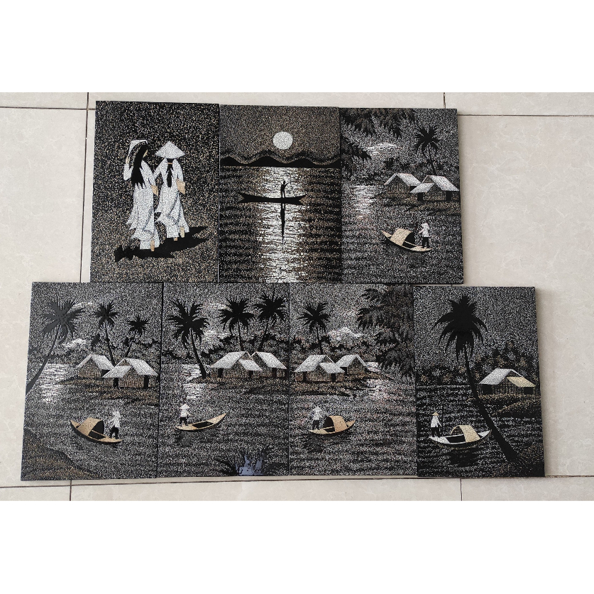 Tranh sơn mài đồng quê và cô gái áo dài Việt Nam được cẩn vỏ trứng tỉ mỉ, dưới bàn tay của các nghệ nhân đã tạo ra nét uyển chuyển, mềm mại, tấm tranh tuyệt đẹp.