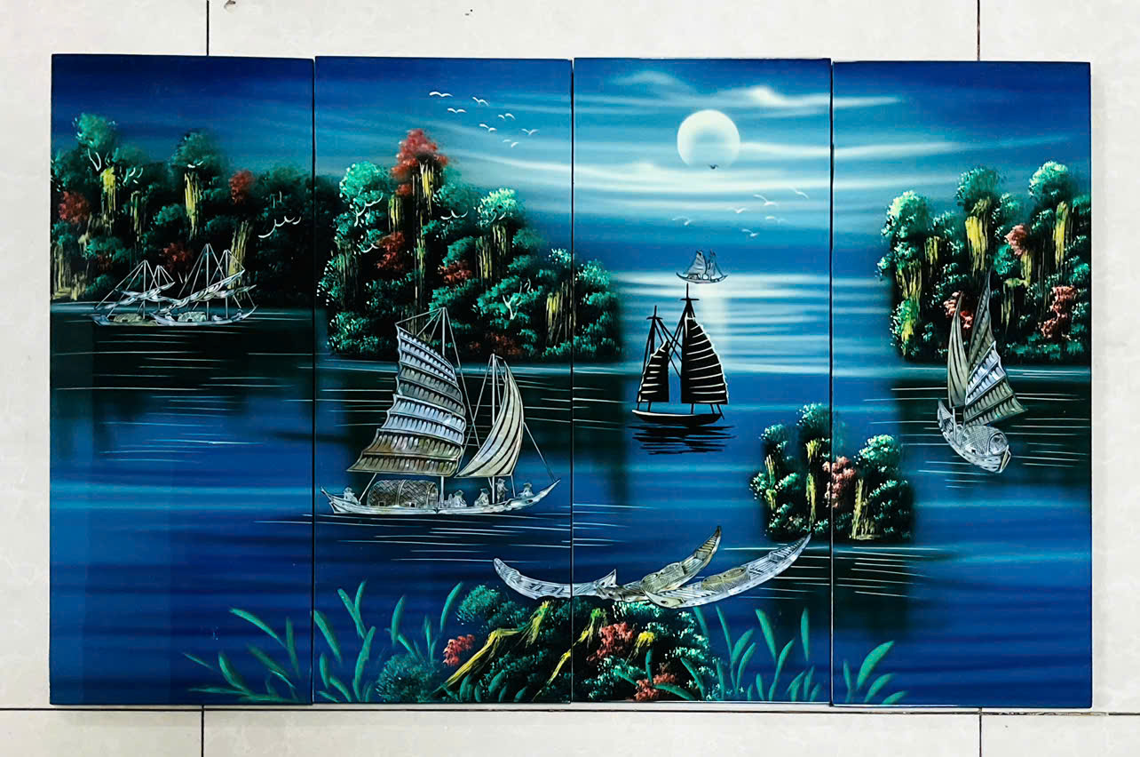Bộ Tranh sơn mài 4 tấm- THUẬN BUỒM XUÔI GIÓ - Khảm cừ cao cấp size 50x80 cm - Ý Nghĩa Phong Thủy