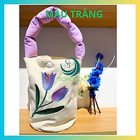 Túi tote nữ, họa tiết hoa Tulip handmade vintage 24x18x18cm - Túi xách canvas hình hoa phong cách Hàn Quốc thanh lịch