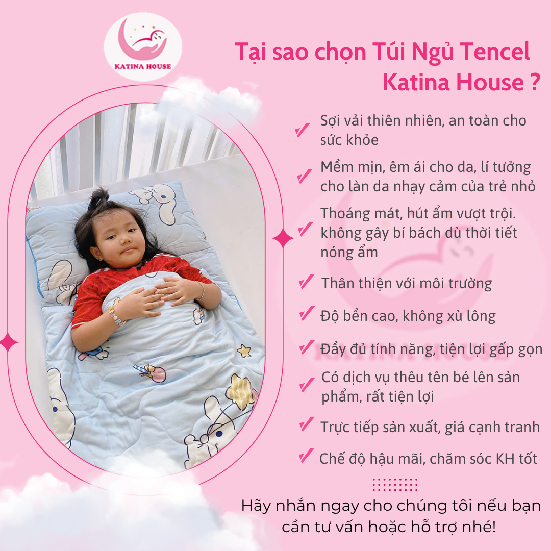 Túi ngủ Katina House cho bé đi học mầm non tiểu học, vải tencel mềm mại, thoáng mát, lành tính