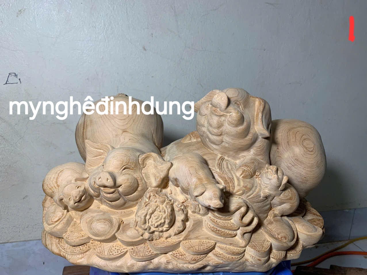 Tượng gia đình lợn phong thủy bằng gỗ ngọc Am thơm nức 39x18x22cm