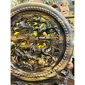 Đĩa trang trí phong thủy ,trạm khắc tứ linh bằng gỗ mun hoa đẹp long lanh kt mặt tròn 40×3,5cm+kệ chân đế cao tổng 48cm