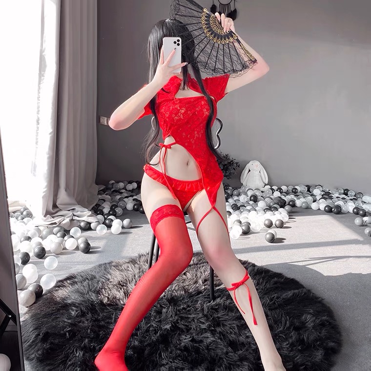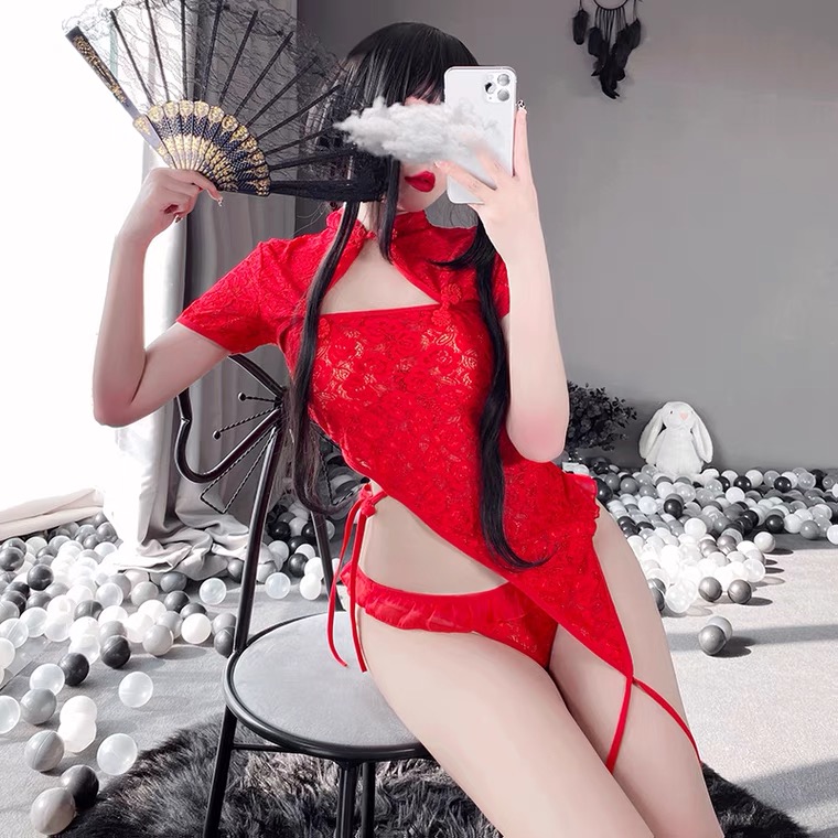 Váy ngủ sườn xám tà lệch dây cột chéo sexy cao cấp Q452 - Đầm ngủ cosplay sườn xám quyến rũ - Đồ ngủ mạc nhà