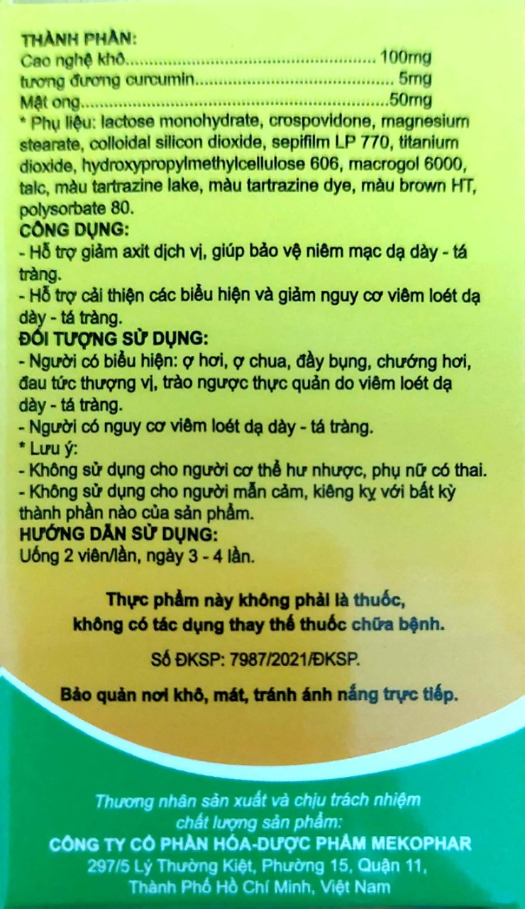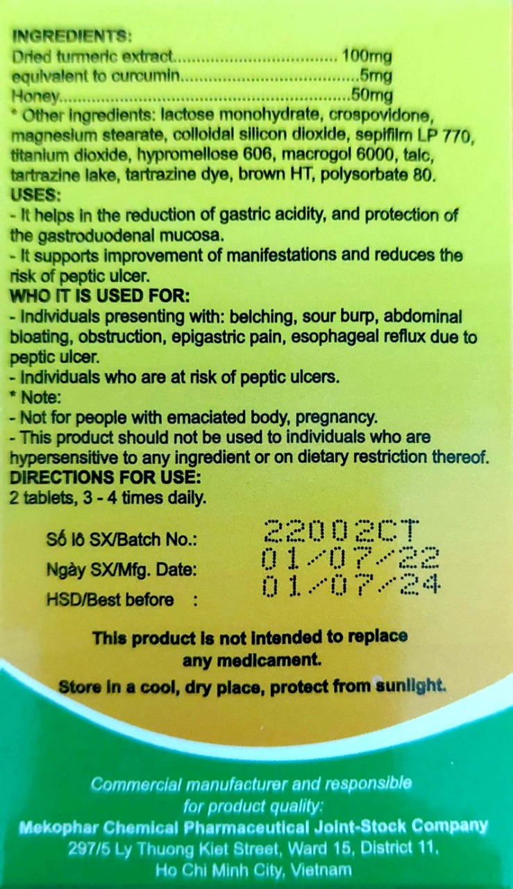 Cao nghệ 400mg tương đương curcumin 5mg; mật ong: 50mg
