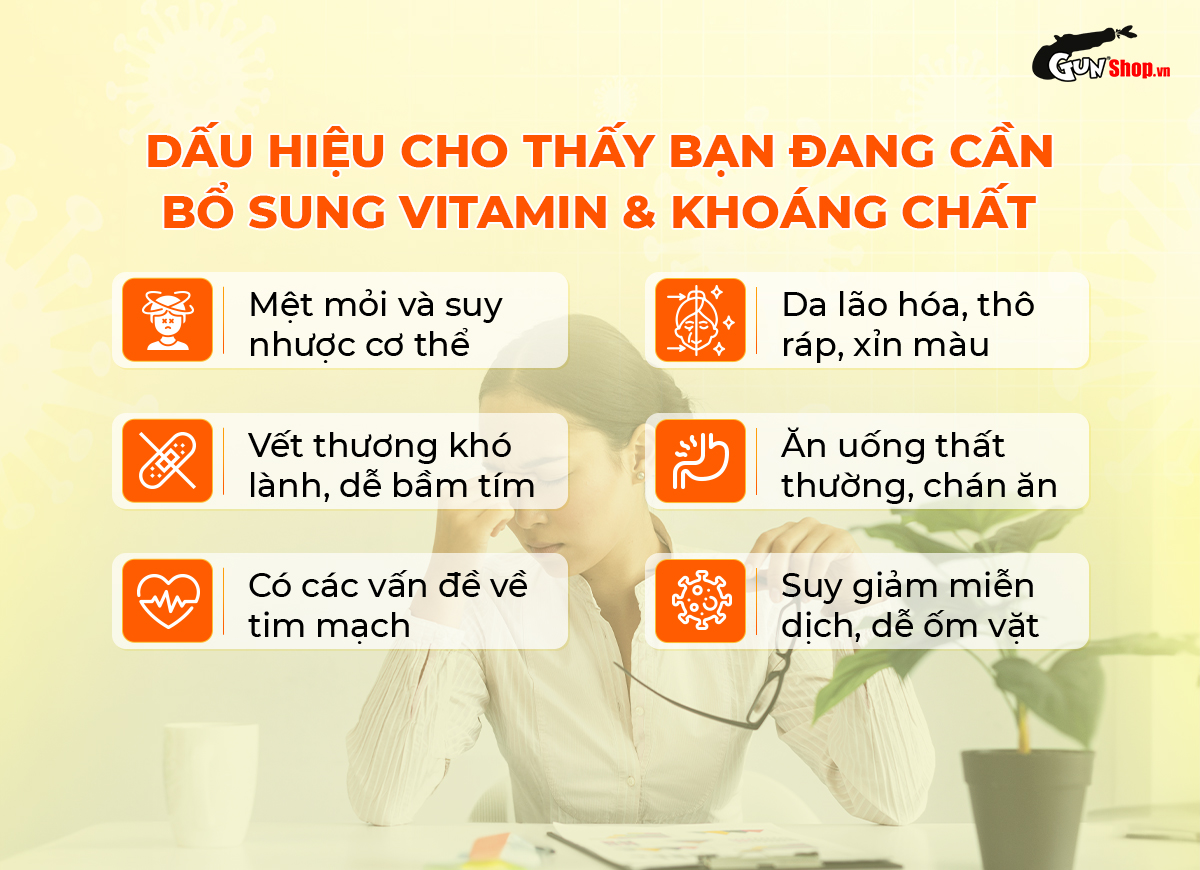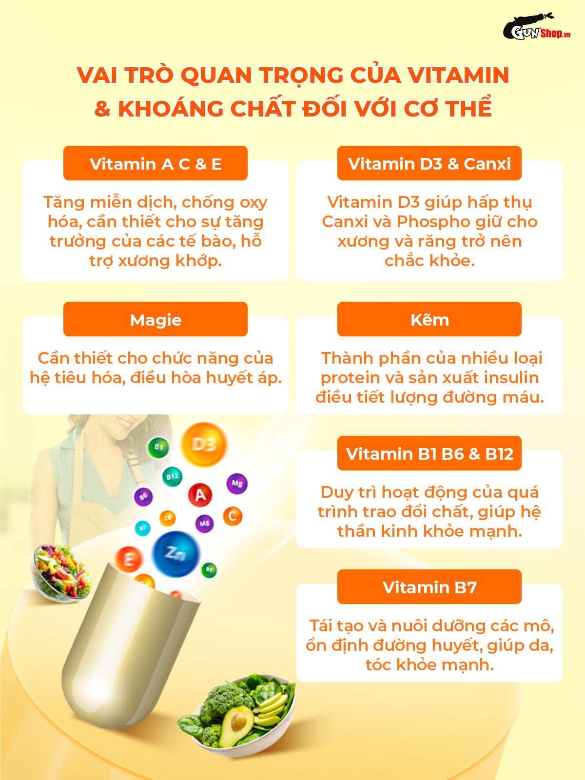 - Bổ sung: Vitamin A, C, E, D3, B1, B6, B7, B12, Canxi, Magie, Kẽm.