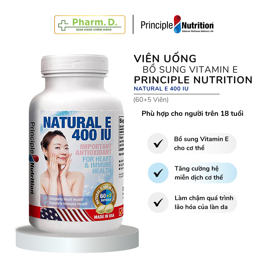 Viên Uống PRINCIPLE NUTRITION Natural Vitamin E 400 IU Giúp Bổ Sung Vitamin E Cho Cơ Thể (Hộp 60+5 Viên) nạp đầy đủ Vitamin E cho cơ thể mỗi ngày giúp làm đẹp da, phòng ngừa tình trạng da khô, nếp nhăn xuất hiện, da lão hóa, hỗ trợ làm chậm quá trình oxy hóa và giúp cấu trúc của tế bào được bảo vệ tối ưu, mang đến cho bạn làn da khỏe đẹp
