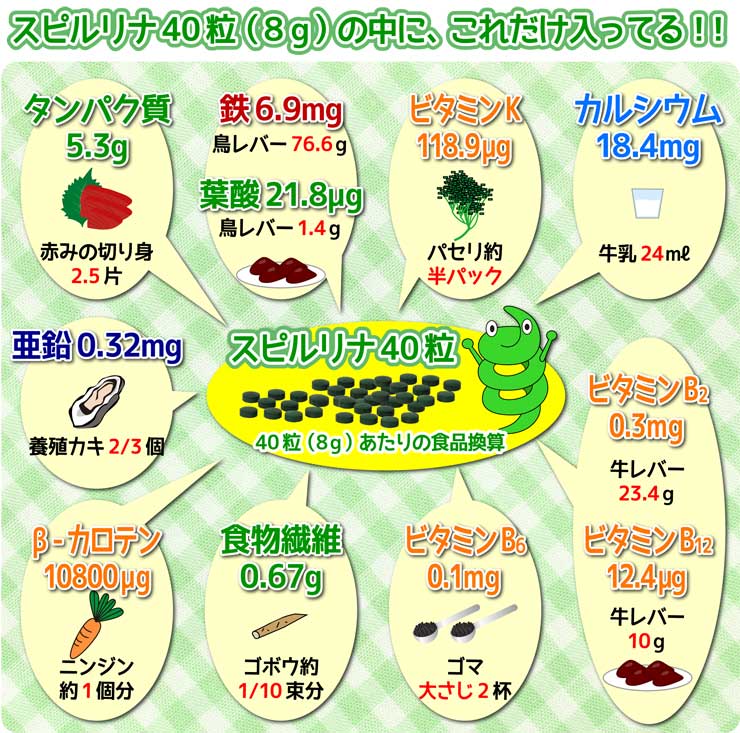 Spirulina chứa hàm lượng lớn các axit amin khác nhau và một hàm lượng lớn các vitamin, chất dinh dưỡng cao gấp đôi so với bất kỳ thực phẩm tự nhiên khác. Chỉ cần 3-10 gram tảo xoắn Spirulina mỗi ngày, bạn đã nạp vào cơ thể các chất cần thiết như: beta carotene, vitamin nhóm B, vitamin E, khoáng chất vi lượng thiết yếu và gamma linolenic acid (GLA). Spirulina là một nguồn chính của chất sắt và canxi.