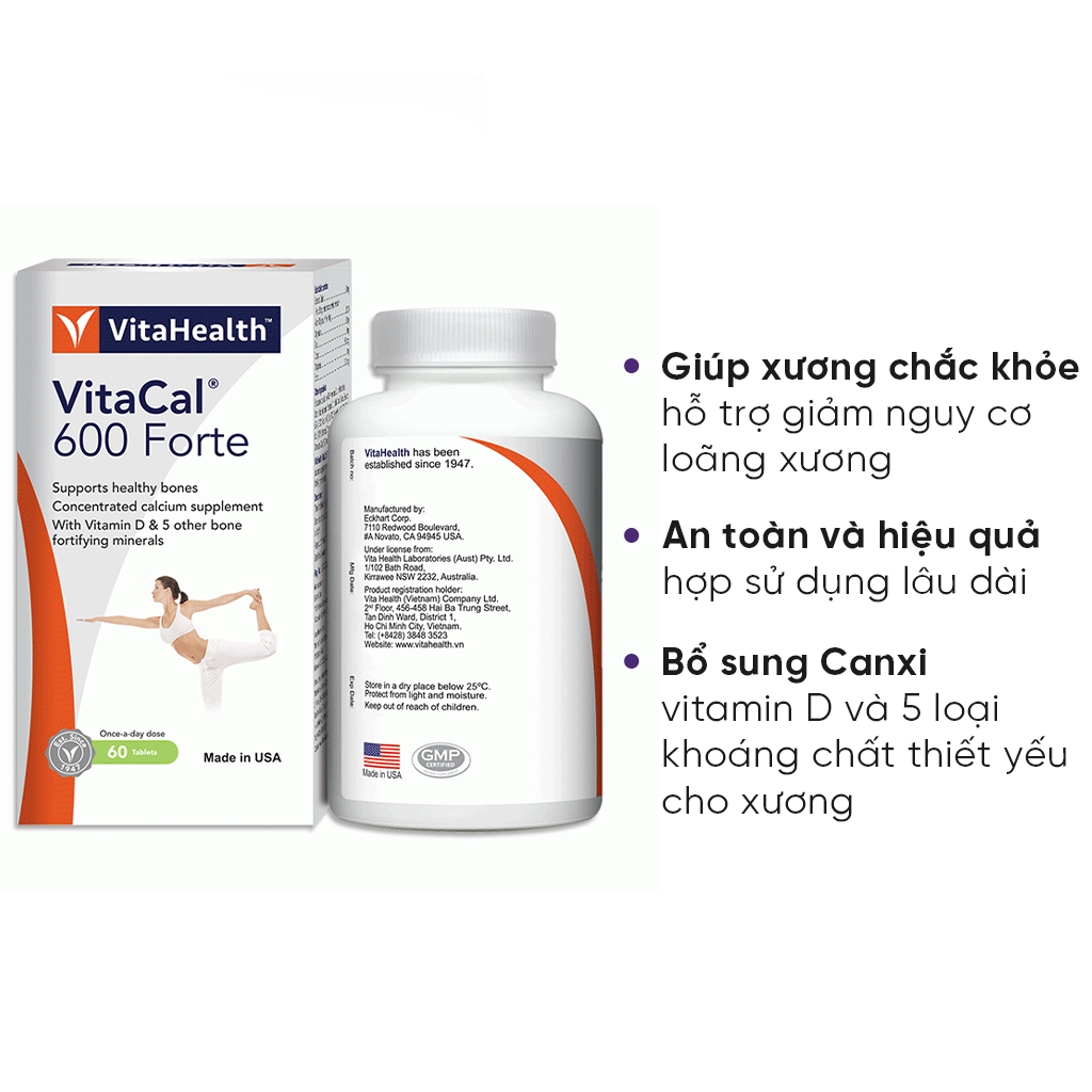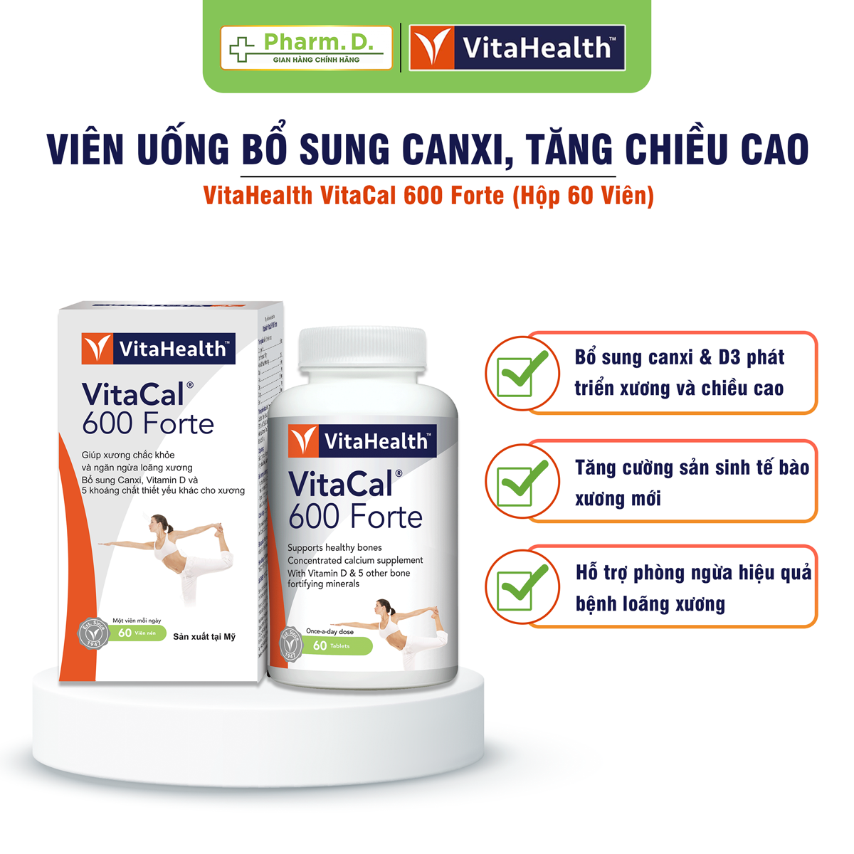 [CHÍNH HÃNG] Viên Uống Bổ Sung Canxi Và D3 Phát Triển Xương Và Chiều Cao VITAHEALTH Vitacal 600 Forte ( Hộp 60 Viên)